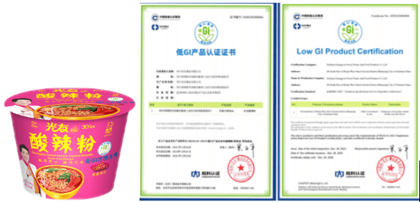 光友低Gi健康粉丝的主要立异是落实大食物不雅的具体表现。中国是世界上马铃薯和红薯第一种植大国,四川是第一大省。该正在部省沉点科技项目支撑下,环绕薯类低Gi产物加工环节手艺及配备研发取财产化研究,处理了加工挤压沉构成型等手艺、配备及使用的瓶颈,实现财产化出产示范。